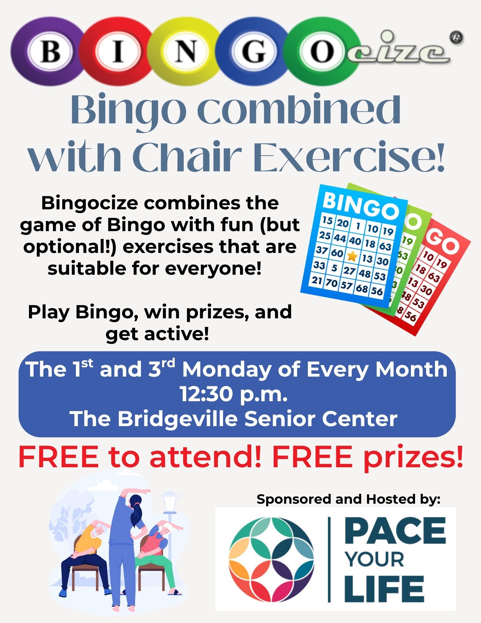 Bingocize is a health promotion program that combines the game of bingo with inclusive exercises for everyone! Come play bingo, learn and exercise. Classes will take place the first and third Monday of every month at 12:30 p.m. Contact the Bridgeville Senior Center to attend. 302-337-8771