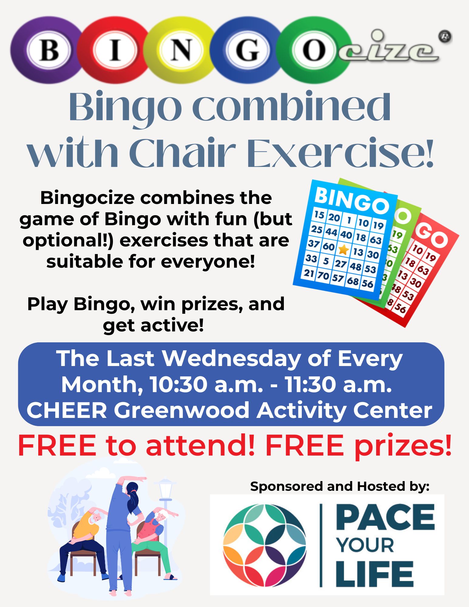 25feb10:30 am11:30 amBingocize at CHEER GreenwoodBingo + Exercise = Bingocize